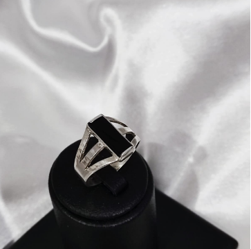 Este anillo artesanal presenta una imponente piedra ónix de forma rectangular, engastada en plata 950 de alta pureza. El ónix, conocido por su color negro profundo y sus propiedades de protección y fuerza interior, destaca en este diseño moderno y sobrio. Ideal para quienes buscan una joya con carácter y estilo distintivo, que aporte elegancia y un toque de misterio a cualquier ocasión.